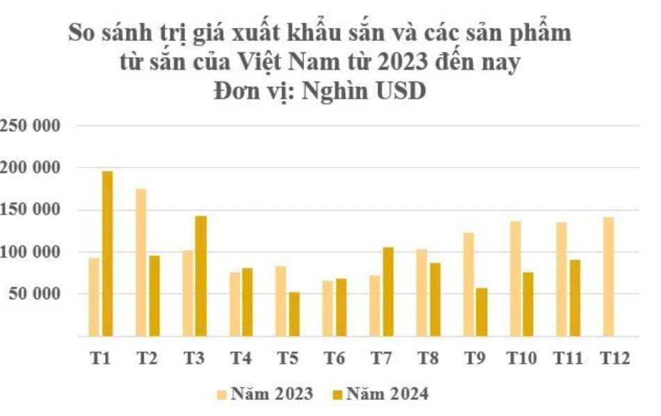 Theo số liệu thống kê sơ bộ của Tổng cục Hải quan, xuất khẩu sắn và các sản phẩm từ sắn trong tháng 11 đã thu về hơn 90,7 triệu USD với hơn 230 nghìn tấn, tăng mạnh 30,8% về lượng và tăng 19,2% về trị giá so với tháng 10.