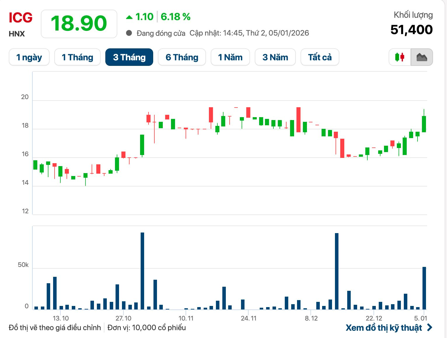 Song song với thông tin tích cực từ khoản đầu tư, cổ phiếu ICG cũng ghi nhận diễn biến khả quan trên thị trường. Trong phiên giao dịch đầu tiên của năm mới (5/1/2026), thị giá ICG tăng hơn 5%, lên 18.900 đồng/cp.