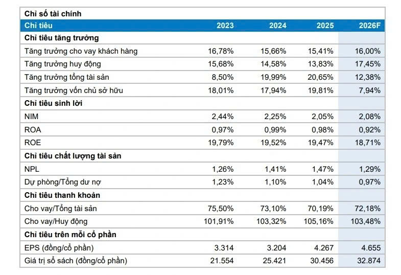 Sử dụng phương pháp Thu nhập thặng dư (Residual Income) và phương pháp so sánh sử dụng P/B để xác định giá mục tiêu cho VCB. BVSC khuyến nghị OUTPERFORM đối với VCB với giá mục tiêu là 86.300 đồng/cổ phiếu, tăng so với giá mục tiêu cũ là 70.800 đồng/cổ phiếu do: (1) Điều chỉnh P/B target lên 2,7x tương đương mức trung bình 3 năm so với mức 2,5x trước đây, chúng tôi kỳ vọng NQ 79-NQ-TW và các thông tin phát hành riêng lẻ sẽ tác động tích cực đến tâm lý nhà đầu tư; và (2) Điều chỉnh định giá về thời điểm đầu năm 2026.