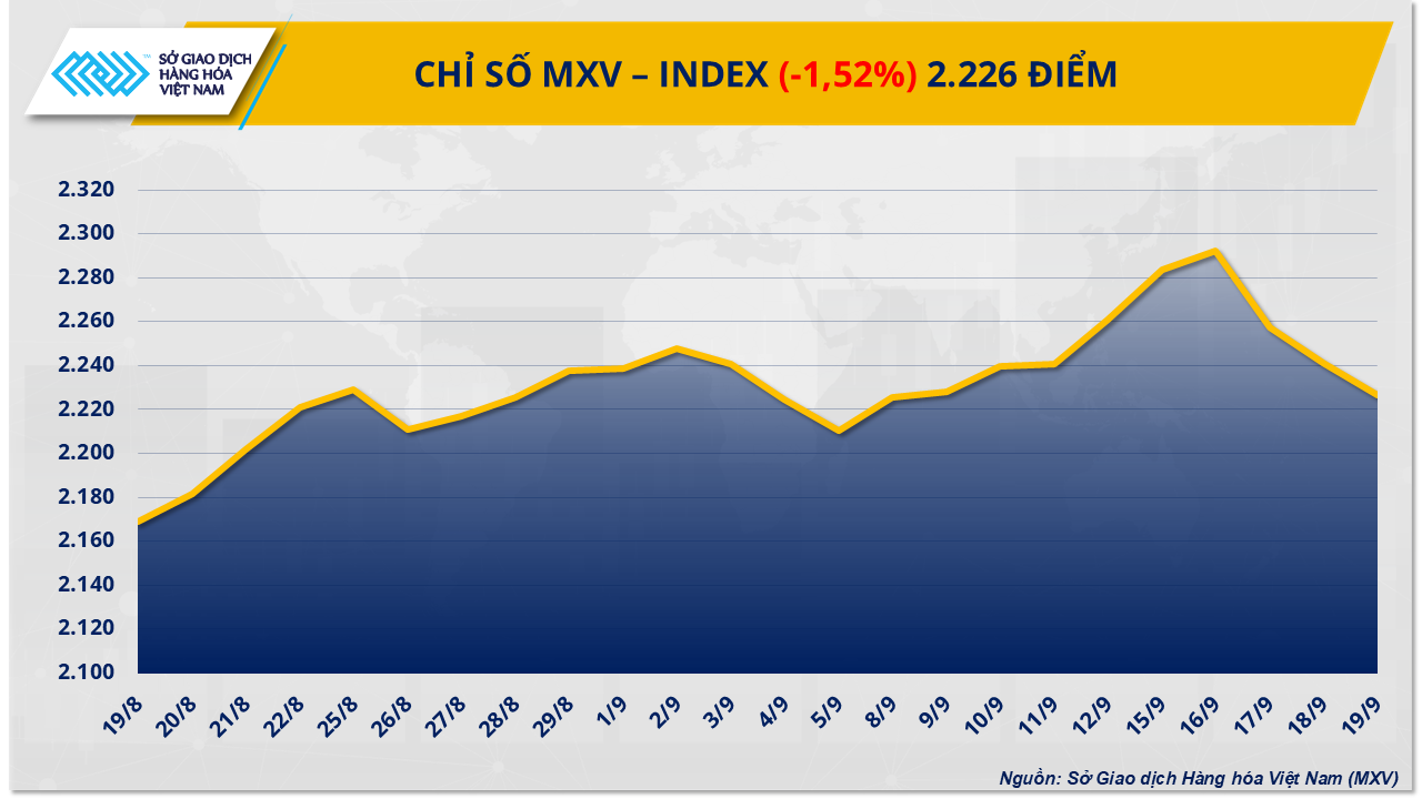 Kết thúc tuần giao dịch vừa qua, thị trường nguyên liệu công nghiệp chứng kiến lực bán áp đảo trên toàn bộ 9 mặt hàng đang được giao dịch trong nhóm. Đáng chú ý, giá cà-phê ghi nhận chuỗi lao dốc mạnh với bốn phiên giảm liên tiếp. Đóng cửa phiên giao dịch ngày 19/9, giá cà-phê Arabica đánh mất tới hơn 7,6%, xuống mức 8.079 USD/tấn trong khi giá cà-phê Robusta cũng ghi nhận mức giảm tới hơn 10% về mức 4.135 USD/tấn.