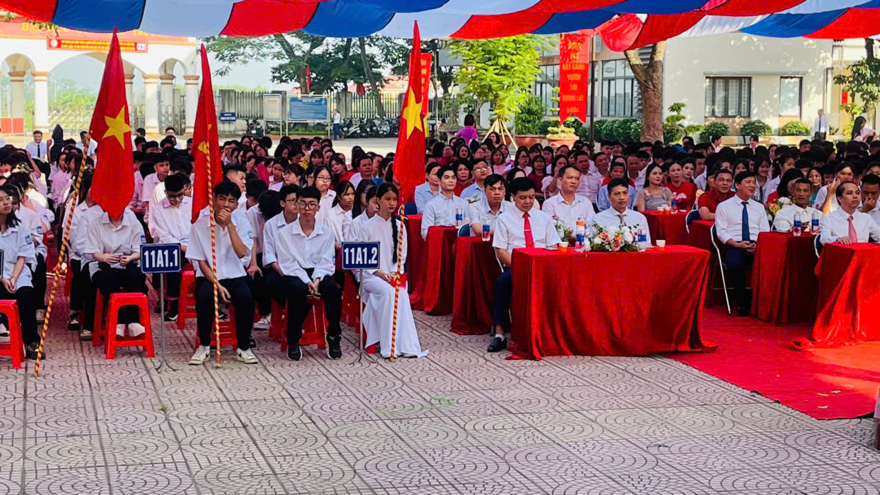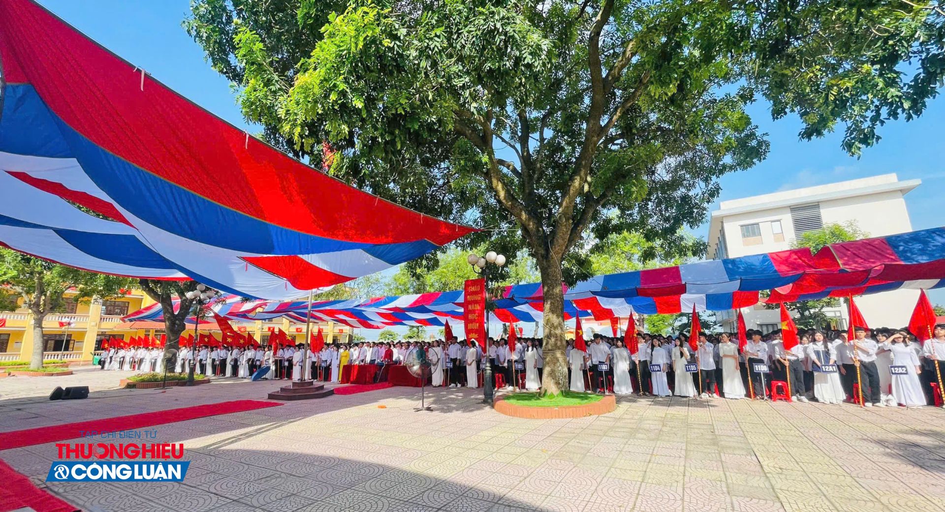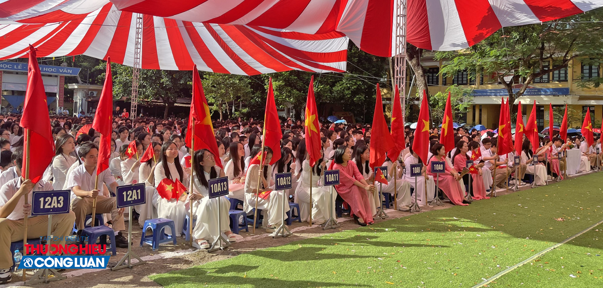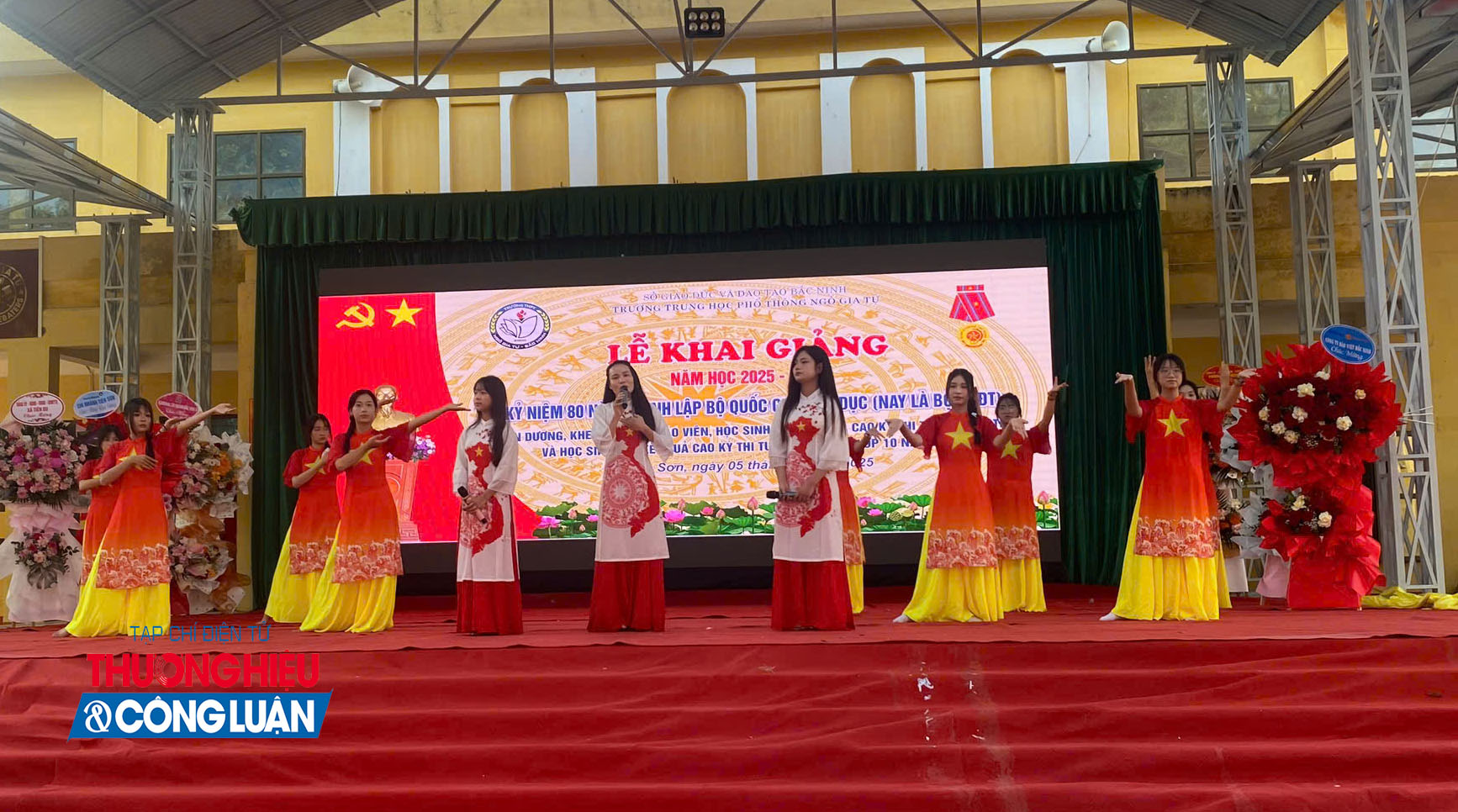 Tại Trường THPT Ngô Gia Tự (tỉnh Bắc Ninh), hơn 1.800 học sinh các khối tham gia lễ khai giảng, sân trường rực rỡ cờ hoa và đầy ắp tiếng trống chào năm học mới.