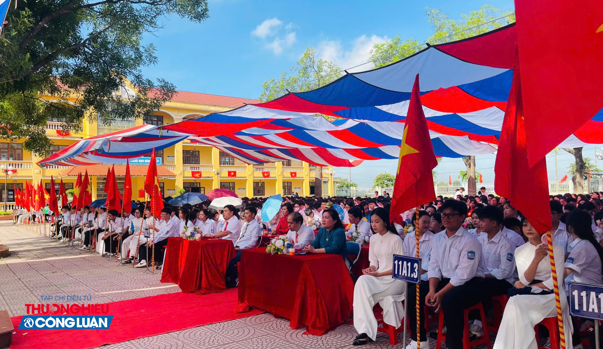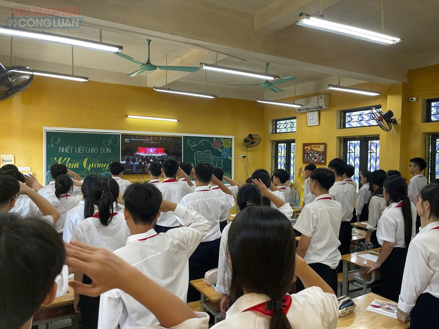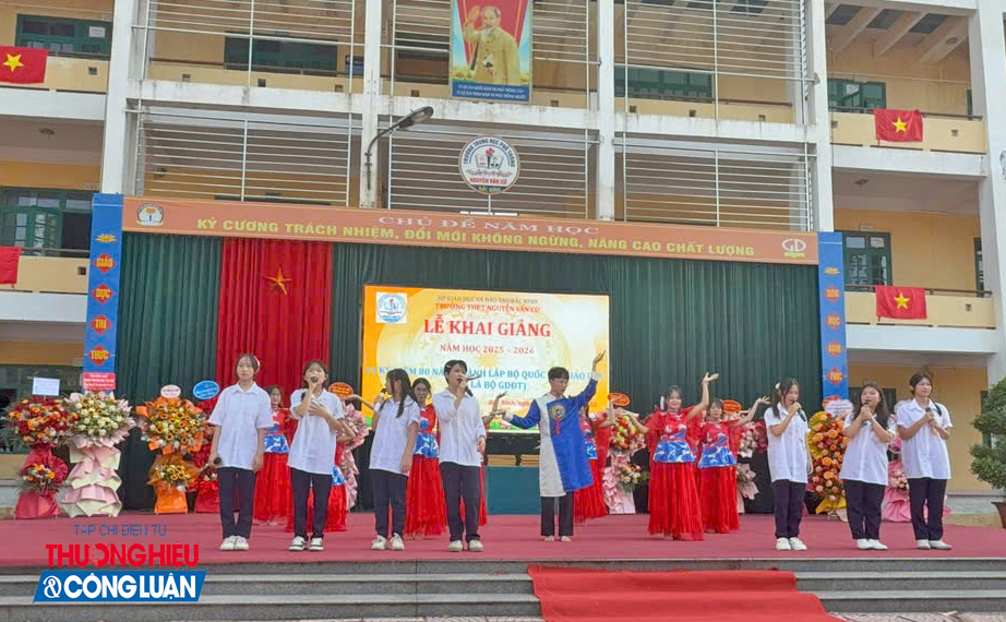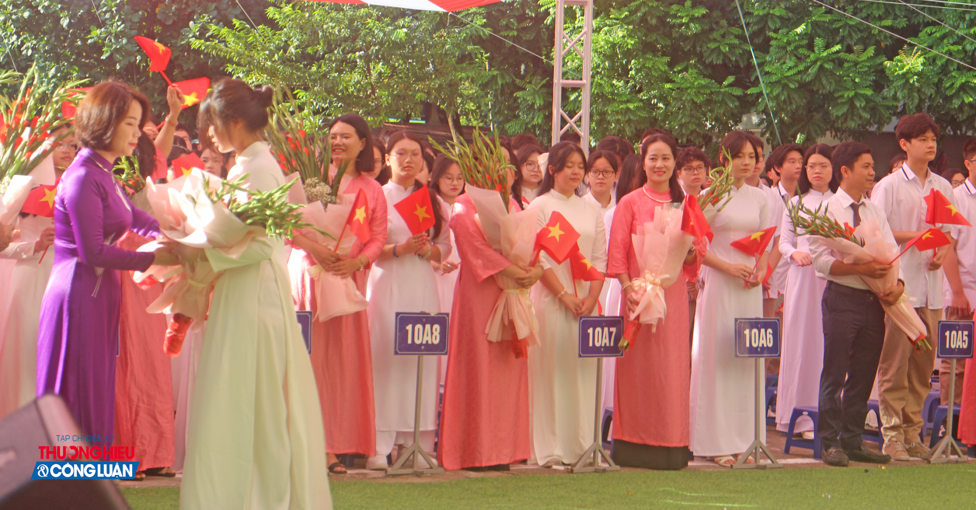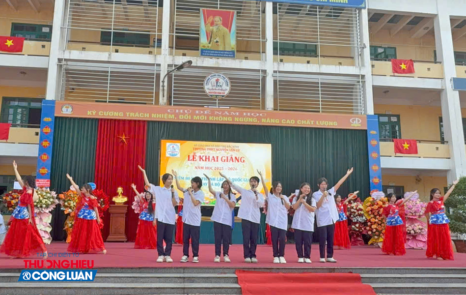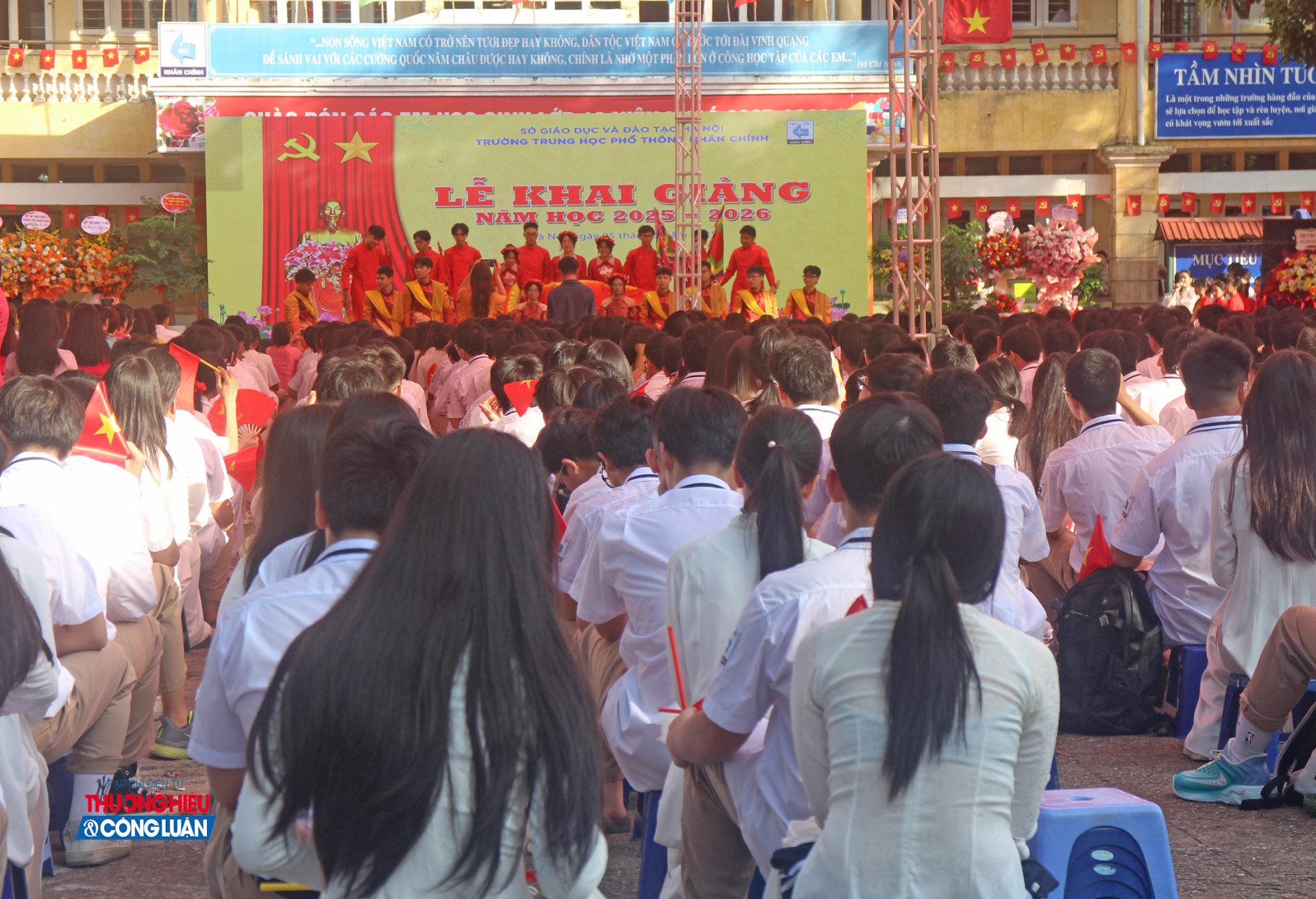 Tại Trường THPT Ngô Gia Tự (tỉnh Bắc Ninh), hơn 1.800 học sinh các khối tham gia lễ khai giảng, sân trường rực rỡ cờ hoa và đầy ắp tiếng trống chào năm học mới.