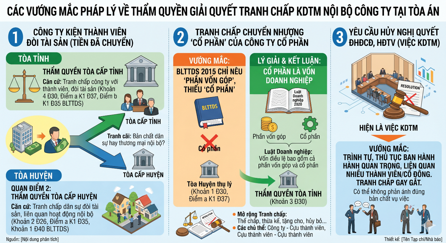 Tuy nhiên, thực tiễn vẫn phát sinh vướng mắc trong việc xác định thẩm quyền giải quyết. Điển hình là trường hợp công ty khởi kiện thành viên (giám đốc chi nhánh) yêu cầu hoàn trả số tiền đã chuyển để phục vụ hoạt động của công ty. Hiện tồn tại hai quan điểm khác nhau: một quan điểm xác định đây là tranh chấp giữa công ty với thành viên công ty nên thuộc thẩm quyền của Tòa án cấp tỉnh; quan điểm khác lại cho rằng đây là tranh chấp dân sự đòi tài sản phát sinh từ quan hệ nội bộ, nên thuộc thẩm quyền của Tòa án cấp huyện theo nơi cư trú của bị đơn.
