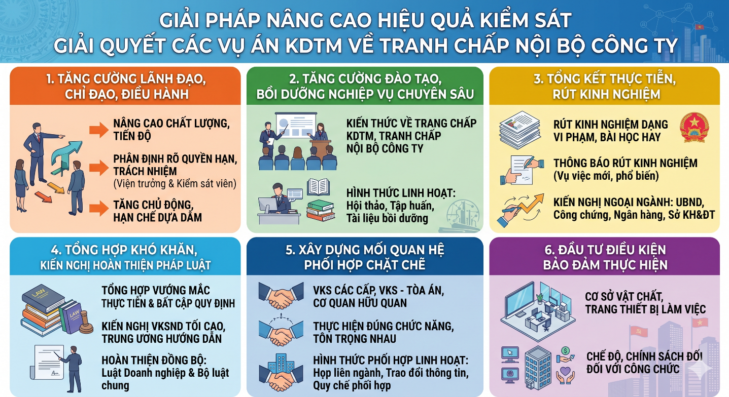 Đối với Viện kiểm sát nhân dân tối cao, cần tăng cường chỉ đạo tổ chức các hội nghị, hội thảo, lớp tập huấn chuyên sâu về nghiệp vụ, đặc biệt là pháp luật nội dung; xây dựng, hoàn thiện hệ thống tài liệu, giáo trình hướng dẫn về trình tự, thủ tục và phương thức kiểm sát đối với các vụ án kinh doanh thương mại, nhất là tranh chấp nội bộ công ty. Đồng thời, chủ động phối hợp với Tòa án nhân dân tối cao trong việc hướng dẫn, giải đáp những khó khăn, vướng mắc phát sinh từ thực tiễn, bảo đảm thống nhất nhận thức và áp dụng pháp luật trong toàn hệ thống.