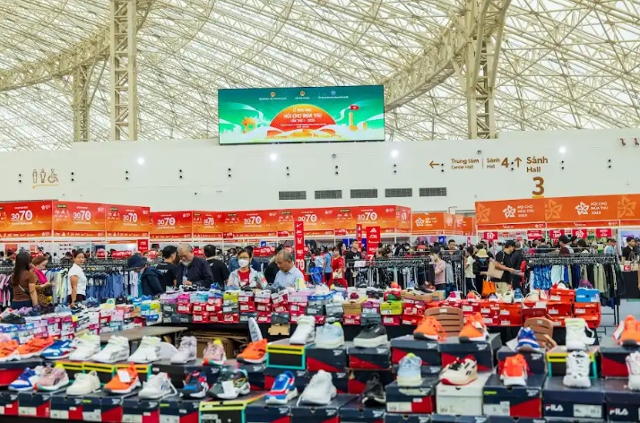 Sảnh 5 và sảnh 4 lại mang sắc thái của một khu chợ hiện đại, nơi trình làng bộ sưu tập các loại thực phẩm tiêu dùng như trà, sữa, cháo, lạp xưởng đến thiết bị nội thất, trang trí nhà cửa, đá phong thủy, thiết bị gia dụng. Trong khi đó, sảnh 3 trở thành “sàn diễn” của gần 200 thương hiệu thời trang, mỹ phẩm, phụ kiện, dược mỹ phẩm…