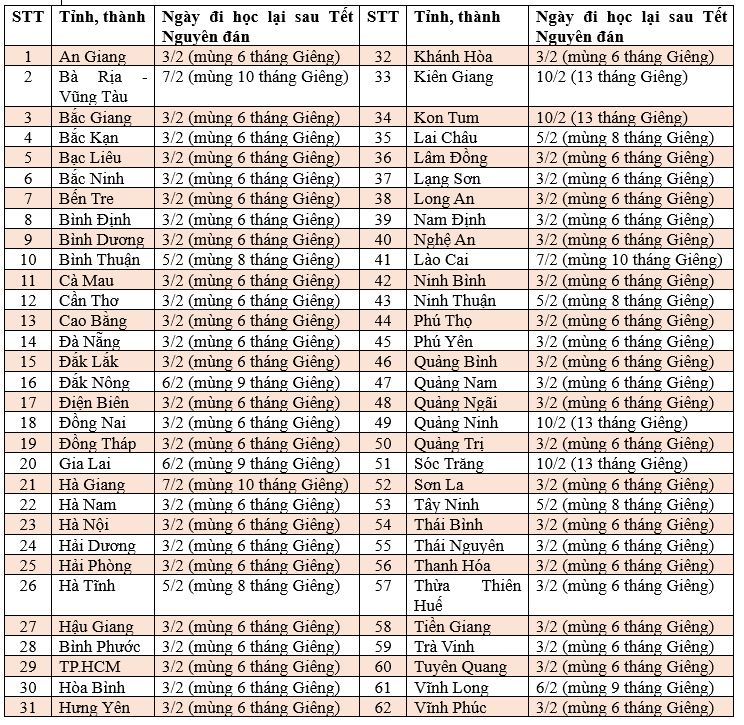 Các địa phương sẽ cho học sinh đi học trở lại sớm nhất từ ngày 3/2 (tức ngày mùng 6 tháng Giêng) và muộn nhất là ngày 10/2 (tức ngày mùng 13 tháng Giêng).