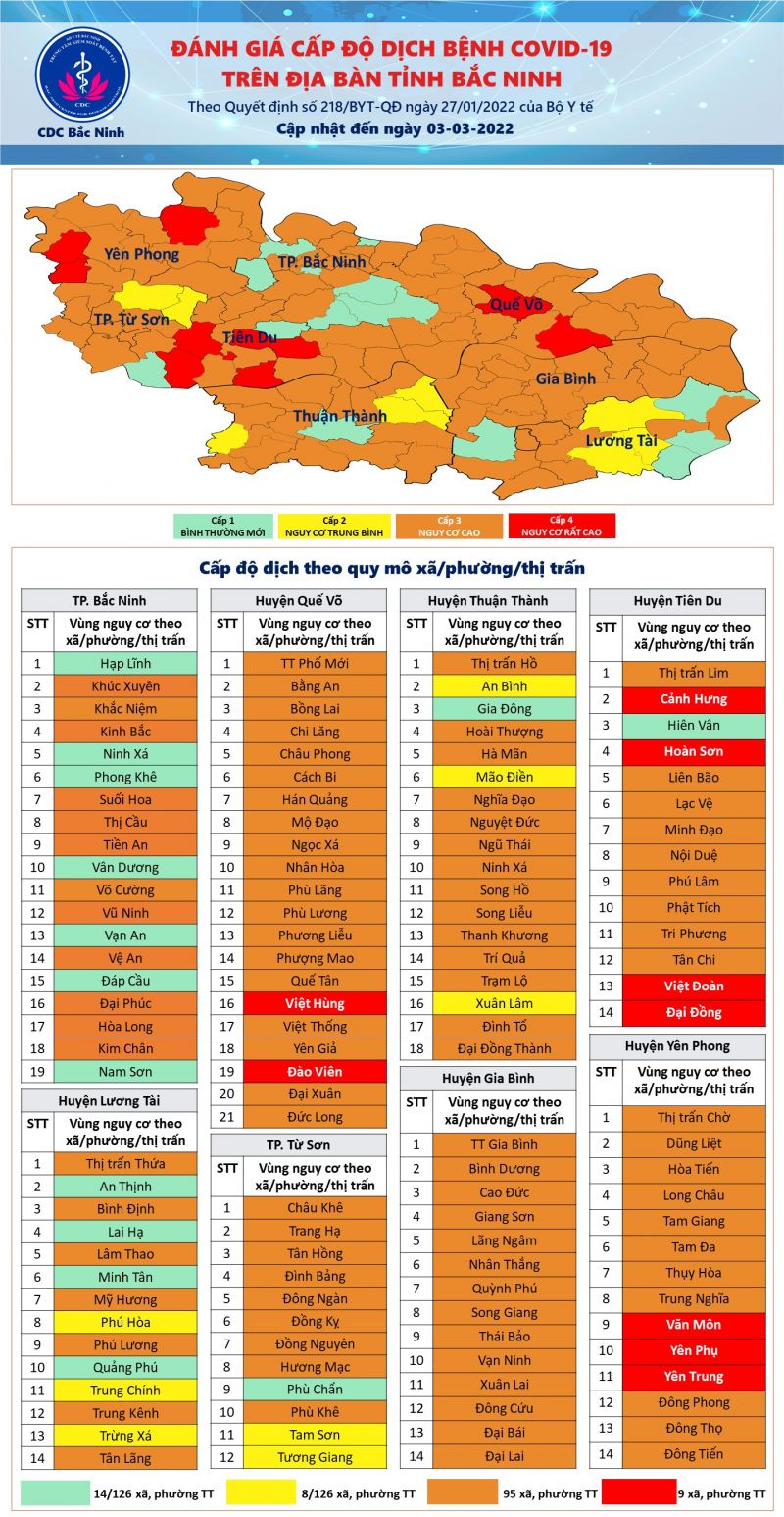 Cụ thể, thành phố Bắc Ninh có 1.272 ca; huyện Tiên Du 871 ca; thành phố Từ Sơn 306 ca; huyện Lương Tài 277 ca; huyện Quế Võ 950 ca; huyện Gia Bình 217 ca; huyện Thuận Thành 521 ca; huyện Yên Phong 1.234 ca. Có 50.112 F0 đã được điều trị khỏi ra viện, hết thời gian quản lý tại nhà. Hiện toàn tỉnh có 41.465 F0 đang điều trị, quản lý, trong đó, có 75 ca nặng.