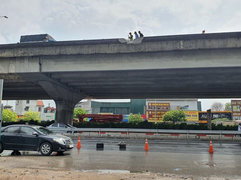 Khoảng 7h50 ngày 6/6, anh T.V.T. (SN 1984, Nghĩa Hưng, Nam Định) lái xe đầu kéo trên Vành đai 3 trên cao, hướng đường Cầu Giấy – Hoàng Mai. Khi đến trước chung cư Eco Green City (đường Nguyễn Xiển, Hoàng Mai), do trời mưa, đường trơn, tài xế đầu kéo tông vào lan can Vành đai 3 trên cao.