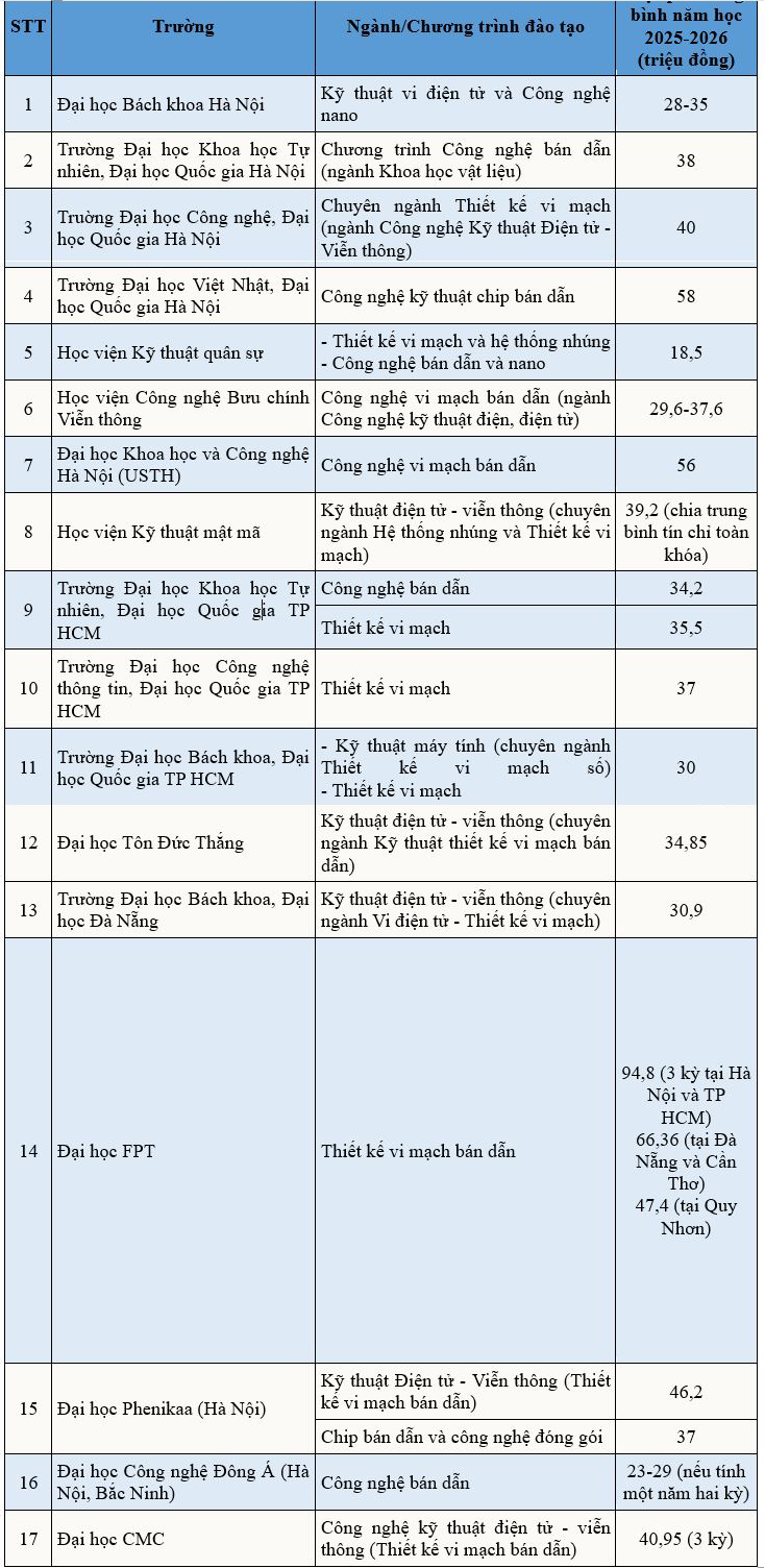 Dưới dây là học phí dự kiến các ngành về bán dẫn của một số trường đại học năm học 2025-2026 như sau: