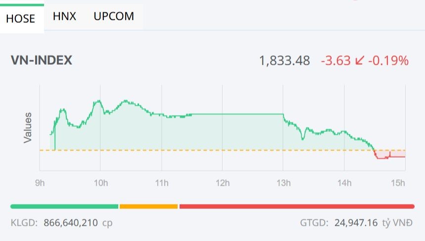 Đóng cửa, sàn HOSE có 99 mã tăng và 227 mã giảm, VN-Index giảm 3,63 điểm (-0,20%), xuống 1.833,48 điểm. Tổng khối lượng giao dịch đạt hơn 866,6 triệu đơn vị, giá trị 24.947,2 tỷ đồng, tăng gần 26% về khối lượng và 15% về giá trị so với phiên hôm qua. Giao dịch thỏa thuận đóng góp hơn 115 triệu đơn vị, giá trị 3.113 tỷ đồng.