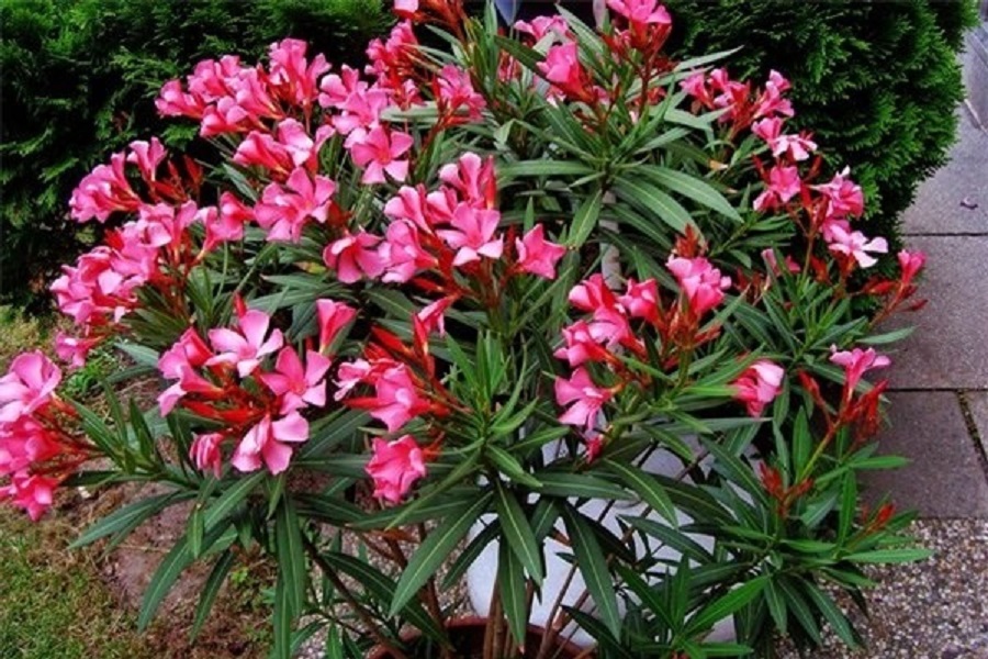 Hoa trúc đào nổi bật với lá xanh mướt và hoa đỏ rực rỡ, thường được trồng để trang trí cảnh quan. Toàn bộ cây, từ lá, hoa, thân đến rễ đều chứa chất độc cardiac glycoside. Chỉ tiếp xúc nhựa cây đã gây đỏ da, sưng tấy. Nếu nuốt phải, người bệnh gặp buồn nôn, nôn mửa, rối loạn điện giải, yếu cơ và có thể tử vong nếu không cấp cứu kịp thời.