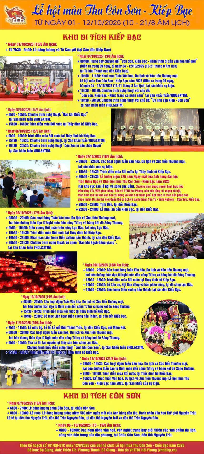 Lễ hội mùa Thu Côn Sơn - Kiếp Bạc năm 2025 là sự kiện văn hóa truyền thống đặc sắc, tiêu biểu đầu tiên của TP. Hải Phòng sau sáp nhập, tưởng niệm 725 năm ngày mất của Anh hùng dân tộc Trần Hưng Đạo, 583 năm ngày mất của Anh hùng dân tộc, Danh nhân Văn hoá Thế giới Nguyễn Trãi. Vinh danh, quảng bá, tuyên truyền sự kiện Quần thể Di tích và Danh thắng Yên Tử - Vĩnh Nghiêm - Côn Sơn, Kiếp Bạc được UNESCO công nhận là Di sản văn hóa Thế giới, góp phần nâng cao ý thức, trách nhiệm của cán bộ, Nhân dân trong việc thực hành, gìn giữ và phát huy giá trị di sản văn hóa dân tộc.