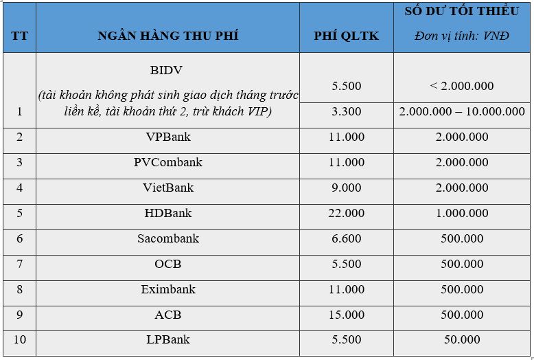 Nhiều ngân hàng thương mại khác như TPBank, LPBank, Vietcombank cũng thu phí quản lý tài khoản với các mức khác nhau, đồng thời miễn phí khi số dư bình quân của tài khoản khách hàng đáp ứng đủ yêu cầu.