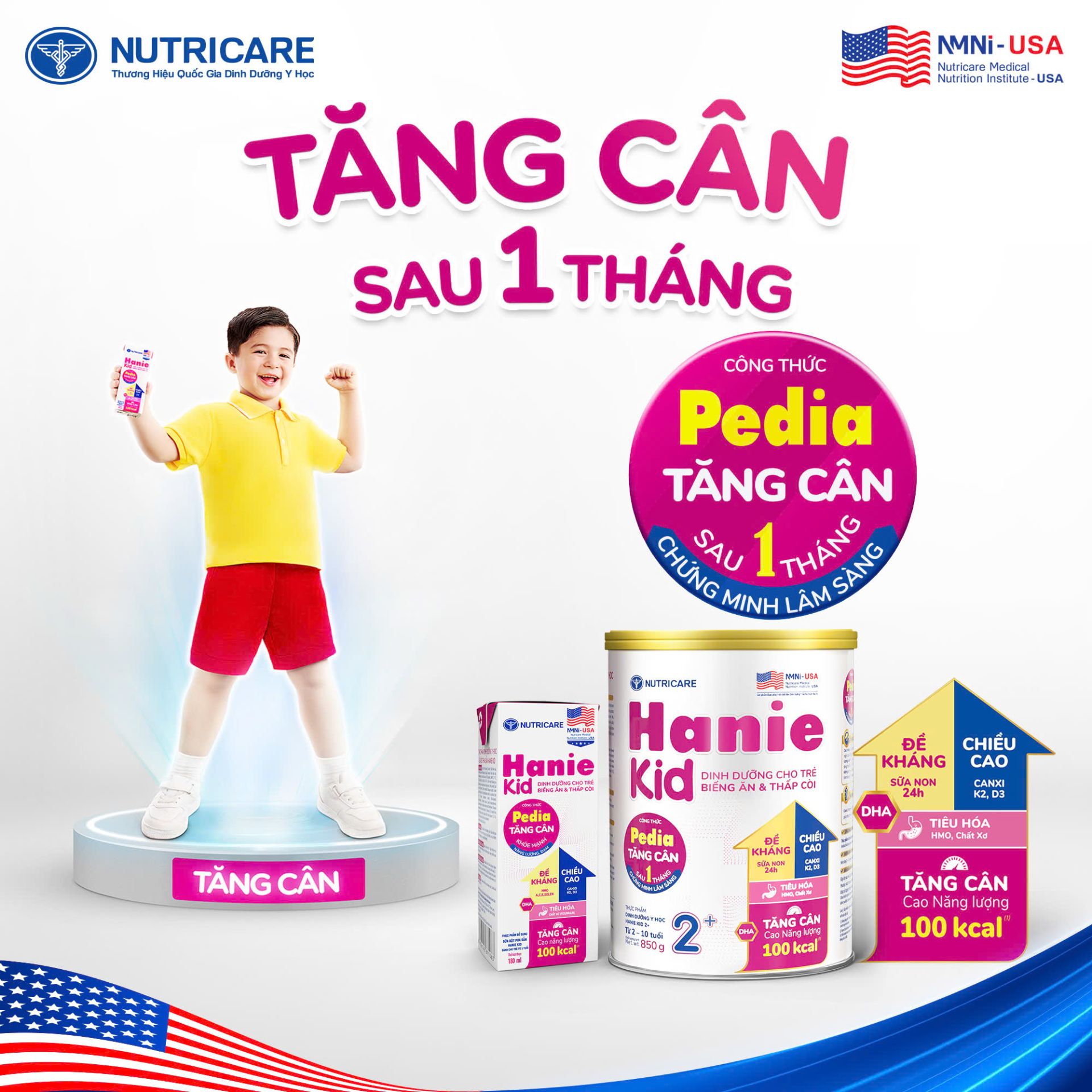 Sản phẩm dinh dưỡng y học Hanie Kid, được nghiên cứu và phát triển bởi Viện Dinh dưỡng y học Nutricare Hoa Kỳ, nhằm hỗ trợ trẻ nhẹ cân, thấp còi tăng cân khỏe mạnh, cải thiện chiều cao và phát triển não bộ. Sản phẩm có công thức cao năng lượng, kết hợp sữa non colos 24h giàu kháng thể IgG, bộ ba canxi, K2, D3 từ Hoa Kỳ, cùng DHA, axit folic, lysine, kẽm và hệ chất xơ FOS/Inulin, HMO, vitamin A, C, E, Selen…