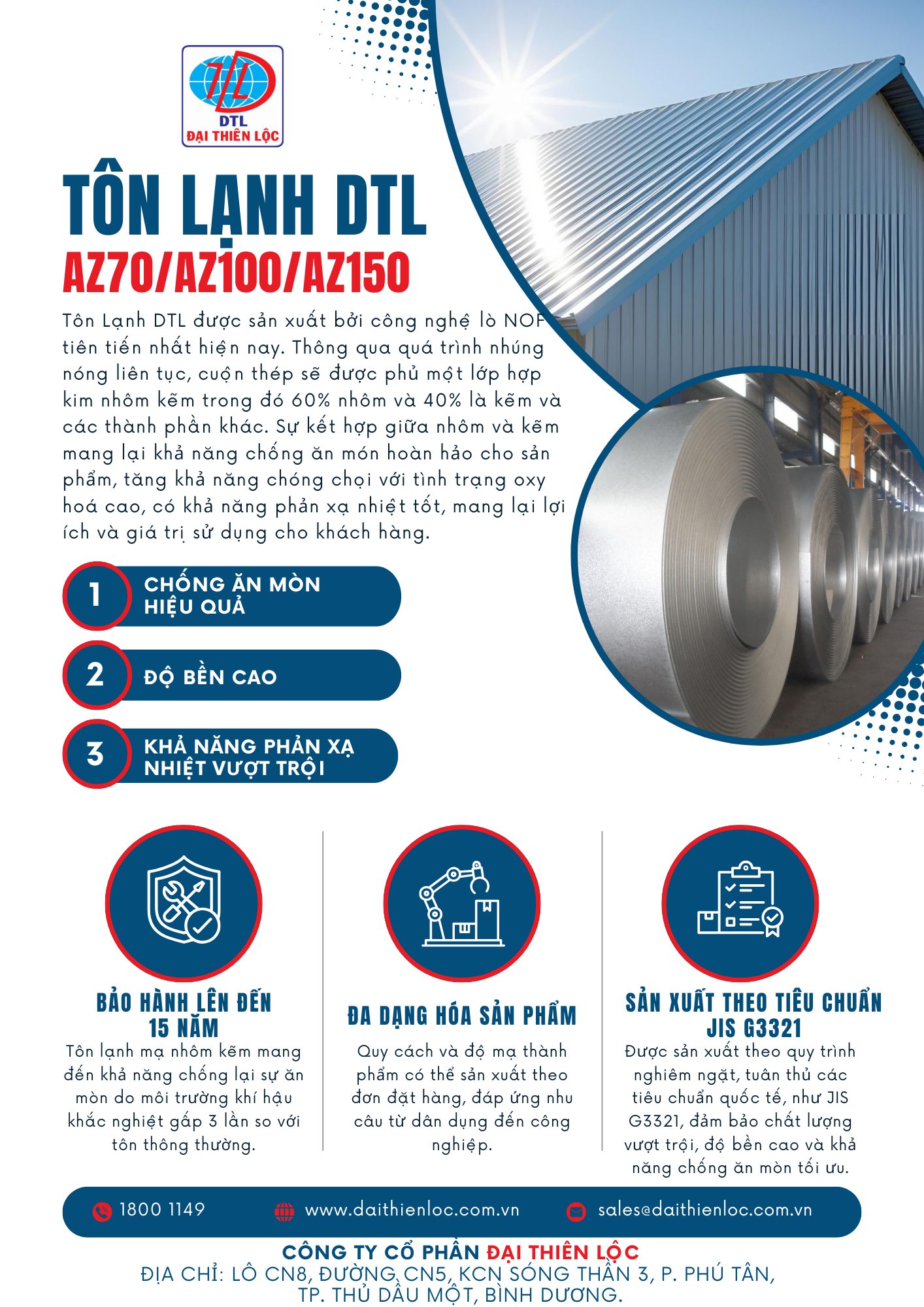 Tôn mạ hợp kim nhôm kẽm, thành phần gồm 55% nhôm, 43,5% kẽm, 1,5% silic trên nền thép lá cán nguội (thép lá đen). Lớp anti-finger phủ trên bề mặt tôn sáng lâu, tránh bong tróc và trầy xước lớp mạ nhôm kẽm trong quá trình dập cán sóng và tạo hình. Không những có chất lượng cao, mà sản phẩm của Đại Thiên Lộc còn có tính thẩm mỹ cao, tăng vẻ đẹp cho công trình.