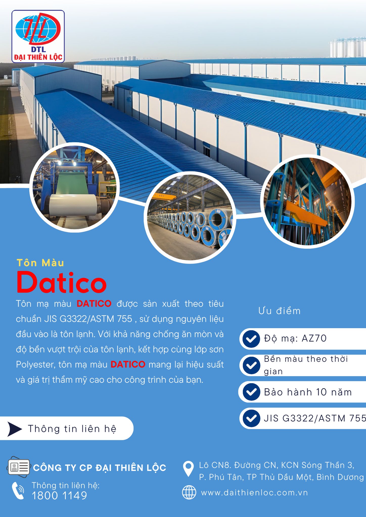 Tôn lạnh màu Đại Thiên Lộc - là sản phẩm tôn mạ màu, được sản xuất dựa trên nền tôn lạnh theo tiêu chuẩn Nhật Bản (JIS G 3321) và Hoa Kỳ (ASTM A792/A792M-10). Sản phẩm nổi bật với lớp mạ hợp kim nhôm kẽm (55% nhôm, 43,5% kẽm, 1,5% silic), kết hợp với lớp sơn phủ bề mặt có độ bền màu cao, không bong tróc, trầy xước khi gia công tạo hình.