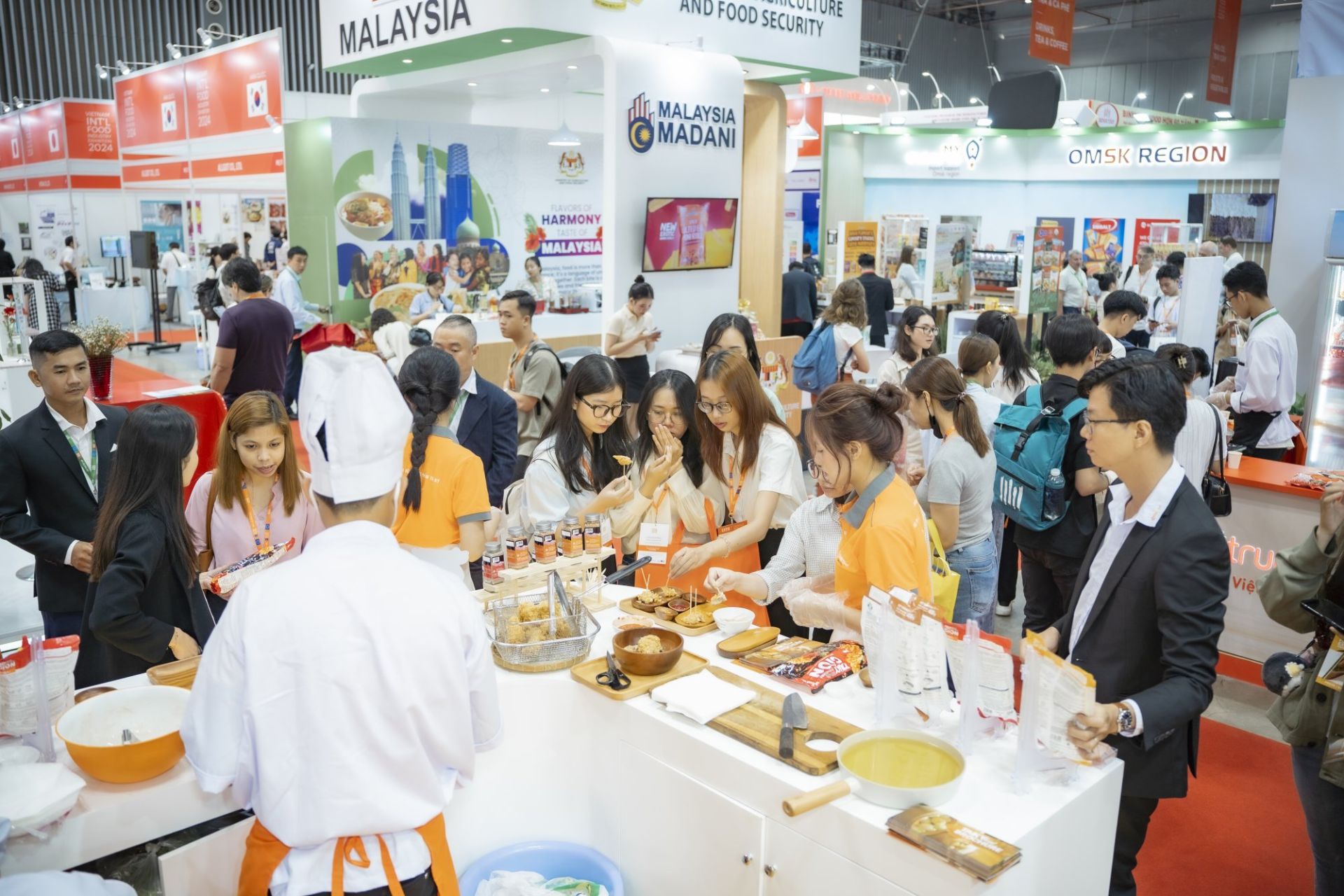 FoodExpo 2024 - sự kiện lớn nhất của ngành thực phẩm tại Việt Nam, thu hút hàng nghìn lượt khách tham quan, doanh nghiệp và các chuyên gia trong ngành. Tại đây, Takyfood đã không chỉ góp mặt với những sản phẩm bột chất lượng cao, mà còn mang đến những trải nghiệm mới mẻ, thú vị cho khách tham quan (Trong ảnh: Khách thăm quan thưởng thức gà chiên từ bột Takygion của Takyfood)