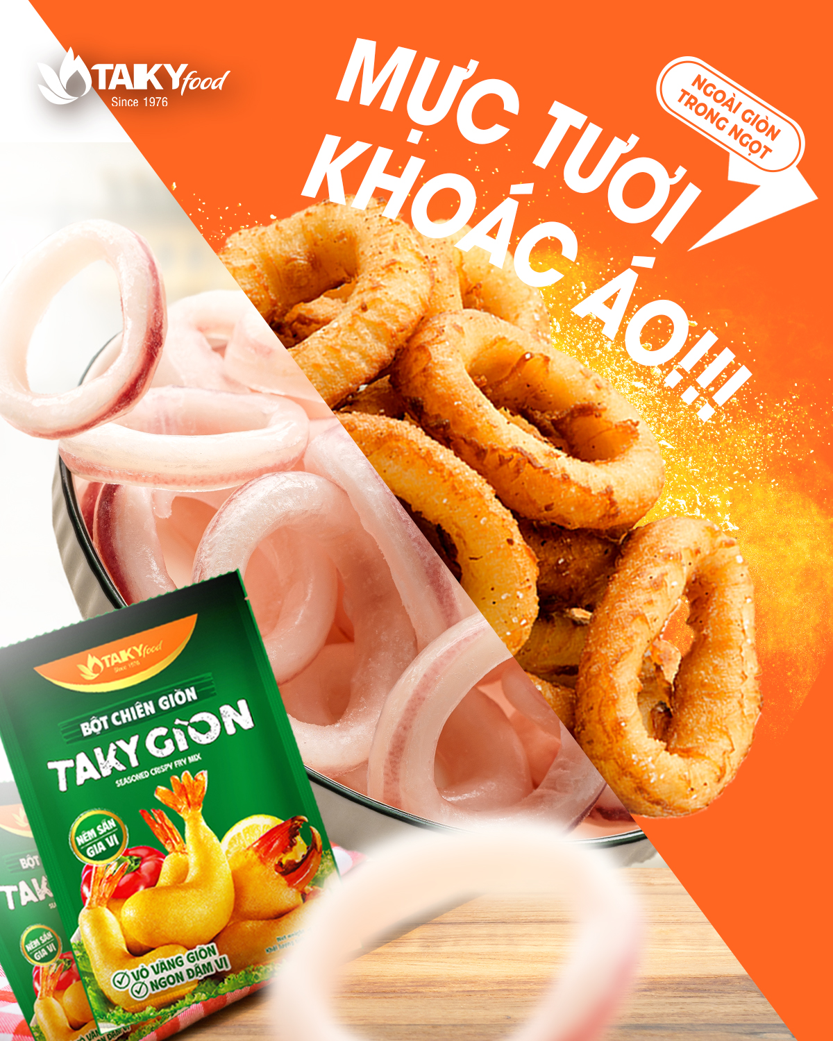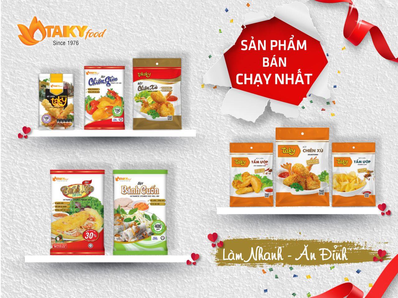 Những sản phẩm của TakyFood, được nhiều người tiêu dùng yêu thích: Bột chiên giòn Tài Ký, bột bánh xèo cốt dừa - bí quyết cho món bánh xèo viền mỏng giòn lâu; bột nếp, bột năng, bột gạo chất lượng dùng làm bánh trôi, bánh dày hay bánh bèo Huế; bột chiên xù...