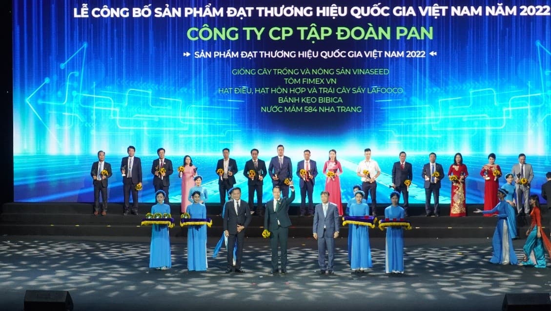 Giống cây trồng - nông sản Vinaseed, tôm Fimex VN, hạt điều, hạt hỗn hợp, trái cây sấy Lafoo, cá tra Aquatex Bentre, bánh kẹo Bibica, nước mắm 584 Nha Trang của Công ty CP Tập đoàn PAN - là những sản phẩm được trao danh hiệu Thương hiệu quốc gia 2024.