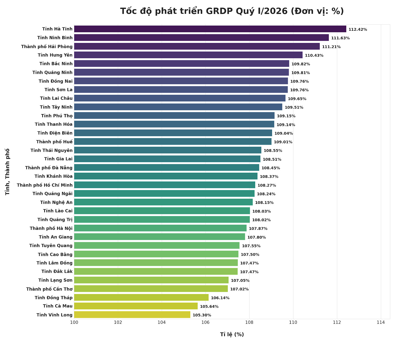 Theo báo cáo của cơ quan Thống kê tỉnh Ninh Bình, tổng sản phẩm trên địa bàn (GRDP) quý I ước đạt 76.665 tỷ đồng, tăng 11,63% so với cùng kỳ năm trước. Đây là mức tăng trưởng cao, phản ánh sự phục hồi mạnh mẽ và bứt phá của nền kinh tế địa phương ngay từ đầu năm.