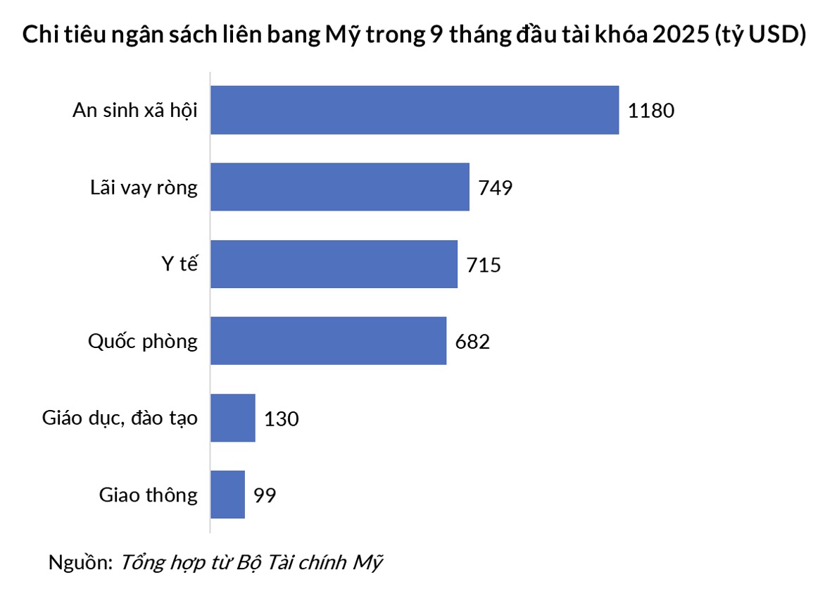 Trong 9 tháng đầu năm tài khóa 2025 (từ tháng 9/2024 đến tháng 6/2025), chi phí lãi vay là khoản chi lớn thứ hai của Chính phủ Mỹ, chỉ sau quỹ an sinh xã hội. Chi trả lãi vay hiện đã lớn hơn chi phí cho y tế, giáo dục, giao thông và cả ngân sách cho quốc phòng.