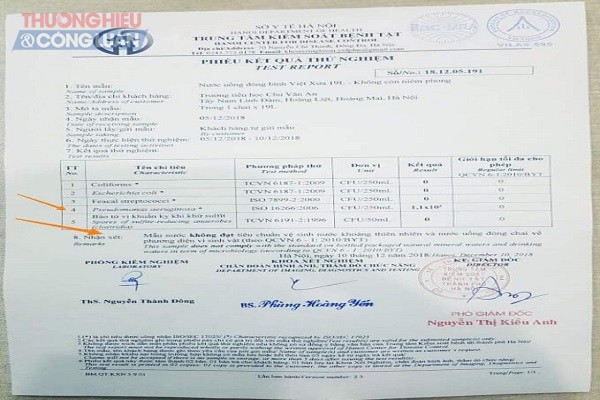 Kết quả thử nghiệm nước uống Việt Xưa tại Trung tâm kiểm soát bệnh tật.