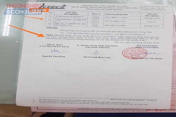 Ngày 15/12, Trung tâm Kiểm soát bệnh tật trả kết quả thử nghiệm hai mẫu, phát hiện trong mẫu bình dùng dở có trực khuẩn mủ xanh (Pseudomonas aeruginosa) với tỷ lệ 110 vi khuẩn trong 250 ml nước. Đơn vị thử nghiệm kết luận mẫu nước không đạt tiêu chuẩn vệ sinh nước khoáng thiên nhiên và nước uống đóng chai về phương diện vi sinh vật.