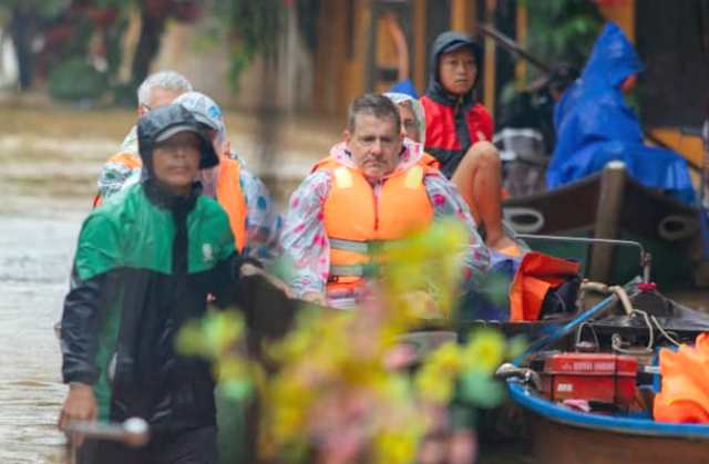 Năm ngày qua, phố cổ Hội An bị nước lũ nhấn chìm, nhiều du khách phải sơ tán bằng thuyền ra khỏi khu vực ngập nặng. Đỉnh lũ rơi vào rạng sáng 30/10, khu vực trũng nhất ven sông Hoài ngập 2,5 m. Các tuyến phố gần sông đều bị ngập từ 1-2 m.