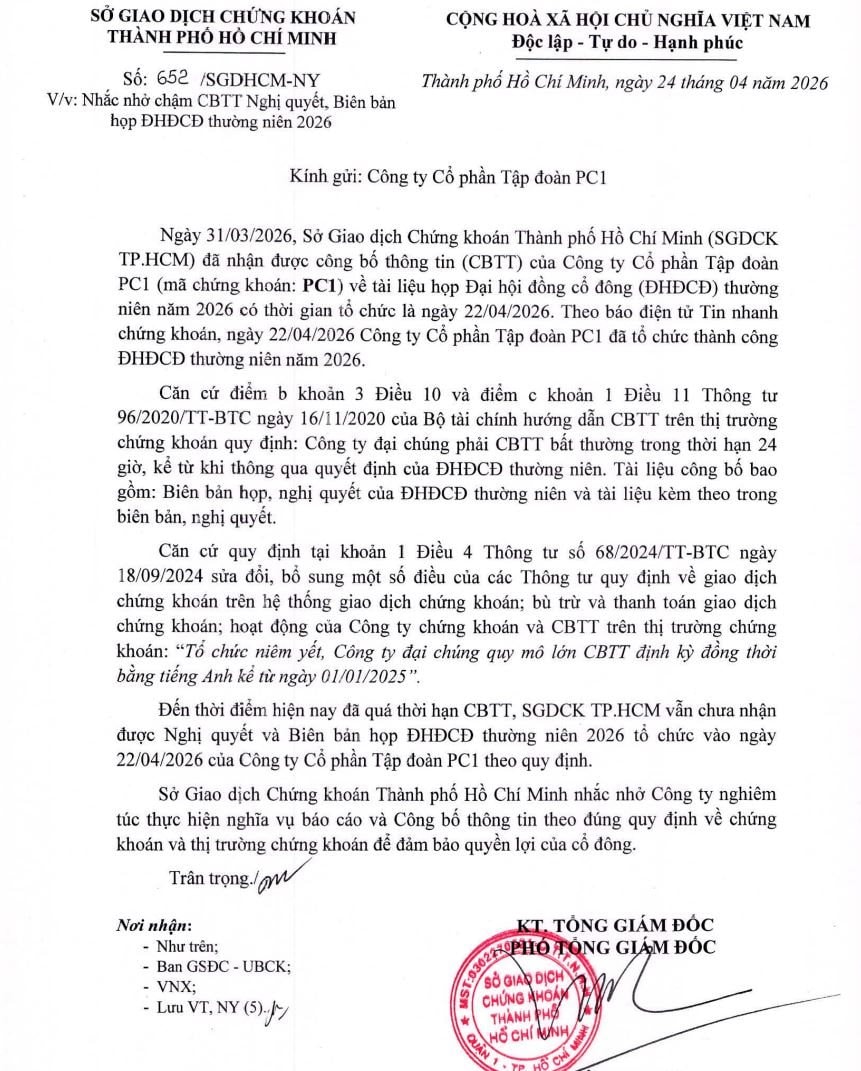 Sở Giao dịch Chứng khoán TP.HCM (HoSE) vừa có văn bản nhắc nhở CTCP Tập đoàn PC1 (MCK: PC1, sàn HoSE) về việc chậm công bố thông tin (CBTT) Nghị quyết và Biên bản họp Đại hội đồng cổ đông (ĐHĐCĐ) thường niên năm 2026.