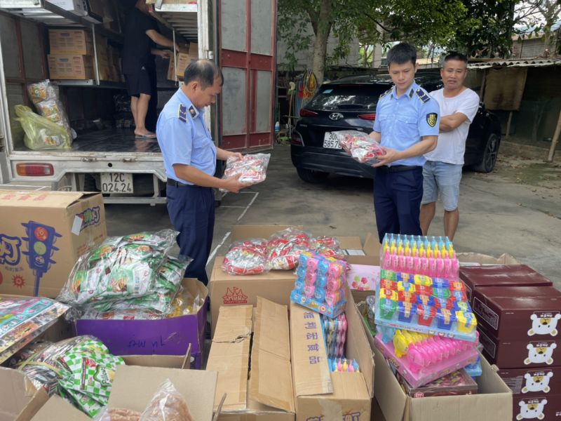 Tại thời điềm khám phương tiện vân tải theo quy định, Tổ công tác đã phát hiện trên khoang chở hàng có trên 5.500 sản phẩm là thực phẩm nhập lậu, gồm: Cánh gà đóng túi hút chân không; chân gà đóng túi hút chân không; đậu chiên bông loại 180 gam/gói; kẹo hình ô tô loại 660 gam/hộp; thạch Jelly hình con thú loại 570 gam/hộp; thạch đóng trong hộp nhựa loại 40 cái/hộp; kẹo mút đựng trong hộp nhựa loại 200 gam/hộp; kẹo cao su đựng trong lọ nhựa loại 350 gam/lọ; nước hoa quả đựng trong lọ nhựa loại 55 ml/lọ; đồ chơi trẻ em các loại…