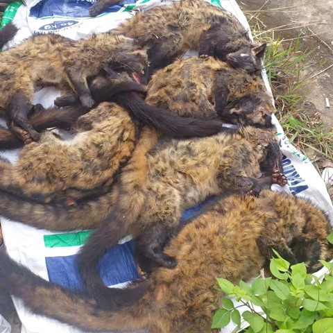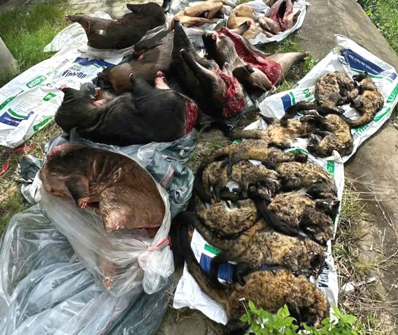 Cụ thể, tang vật gồm 11 cá thể cầy (nghi là cầy mực, thuộc nhóm động vật rừng nguy cấp, quý, hiếm); 6 cá thể động vật đông lạnh không đầu, không chân, lông màu đen (nghi là heo rừng) và 3 cá thể động vật đông lạnh không đầu, không chân, lông màu vàng, chưa xác định được chủng loài.