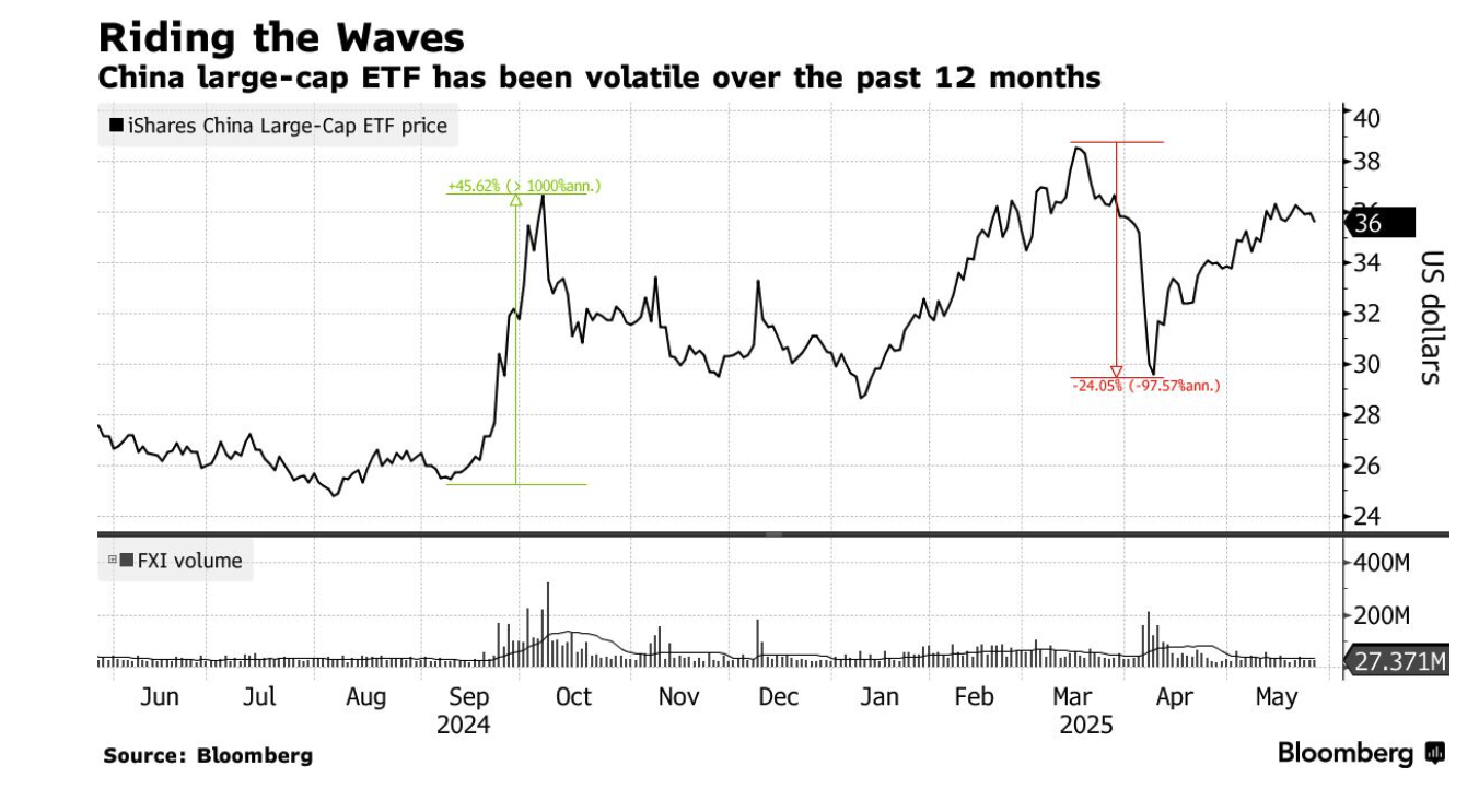 Dù các chỉ số đo lường biến động thị trường hiện đang ở mức thấp, nhưng lịch sử gần đây của quỹ ETF này cho thấy cần phải thận trọng. Chỉ trong vòng 1 năm qua, FXI đã trải qua năm đợt biến động lên xuống khoảng 25% hoặc hơn.