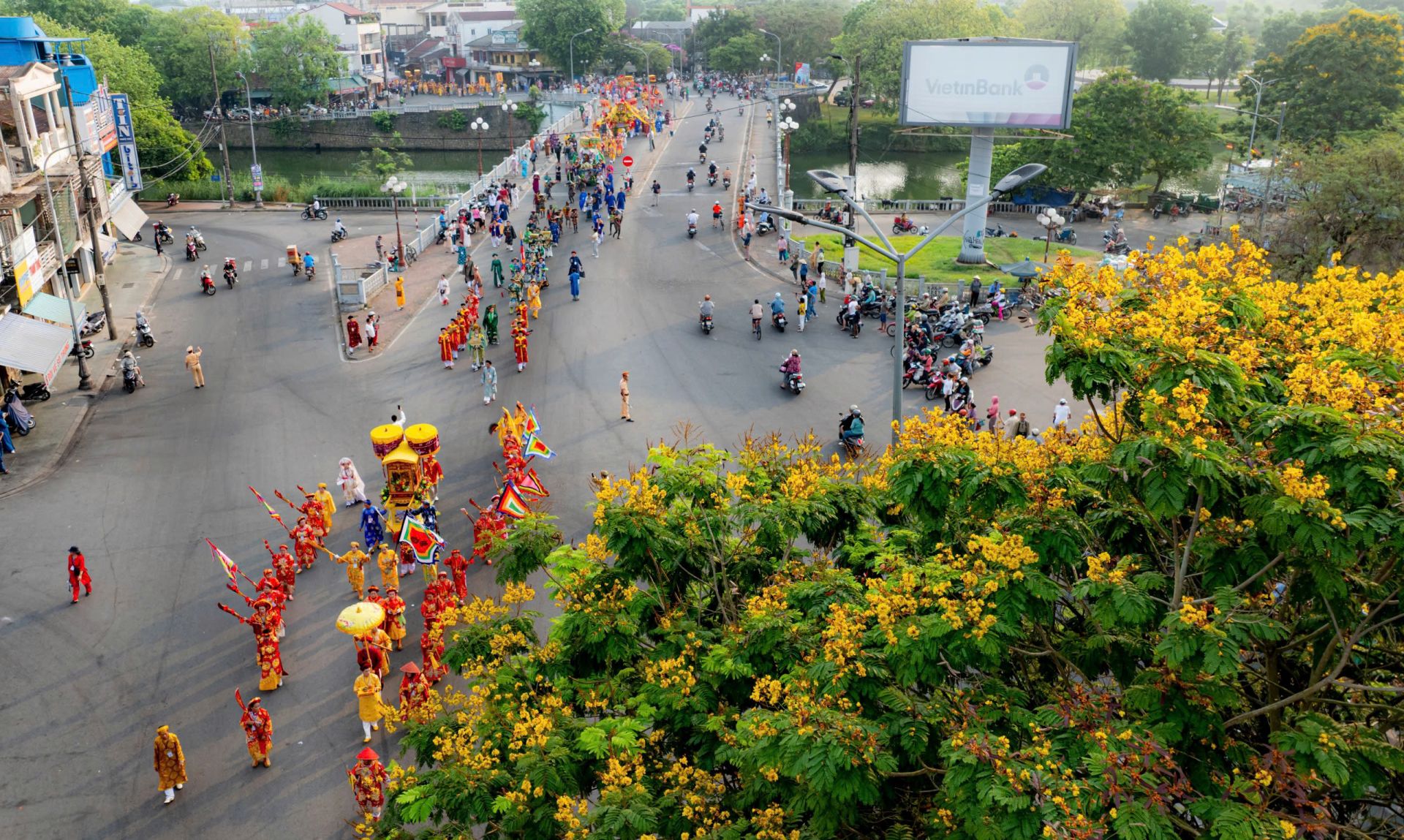 Đông đảo người dân, du khách dự lễ hội Điện Huệ Nam (Điện Hòn Chén) cùng tham gia lễ rước bằng đường bộ từ Thánh đường Thiên Tiên Thánh giáo lên công viên Thương Bạc cạnh sông Hương (đường Trần Hưng Đạo, phường Phú Xuân)