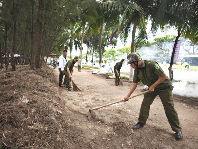 Tại khu vực rừng thông phòng hộ, lực lượng tham gia đã tiến hành phát quang cỏ dại, thu gom thực bì khô, lá thông rụng nhằm hạn chế nguy cơ cháy rừng trong mùa nắng nóng. Toàn bộ rừng phòng hộ, bãi biển, vỉa hè… được dọn dẹp thông thoáng, tạo cảnh quan sạch đẹp, góp phần bảo vệ hệ sinh thái và đảm bảo an toàn phòng cháy chữa cháy.