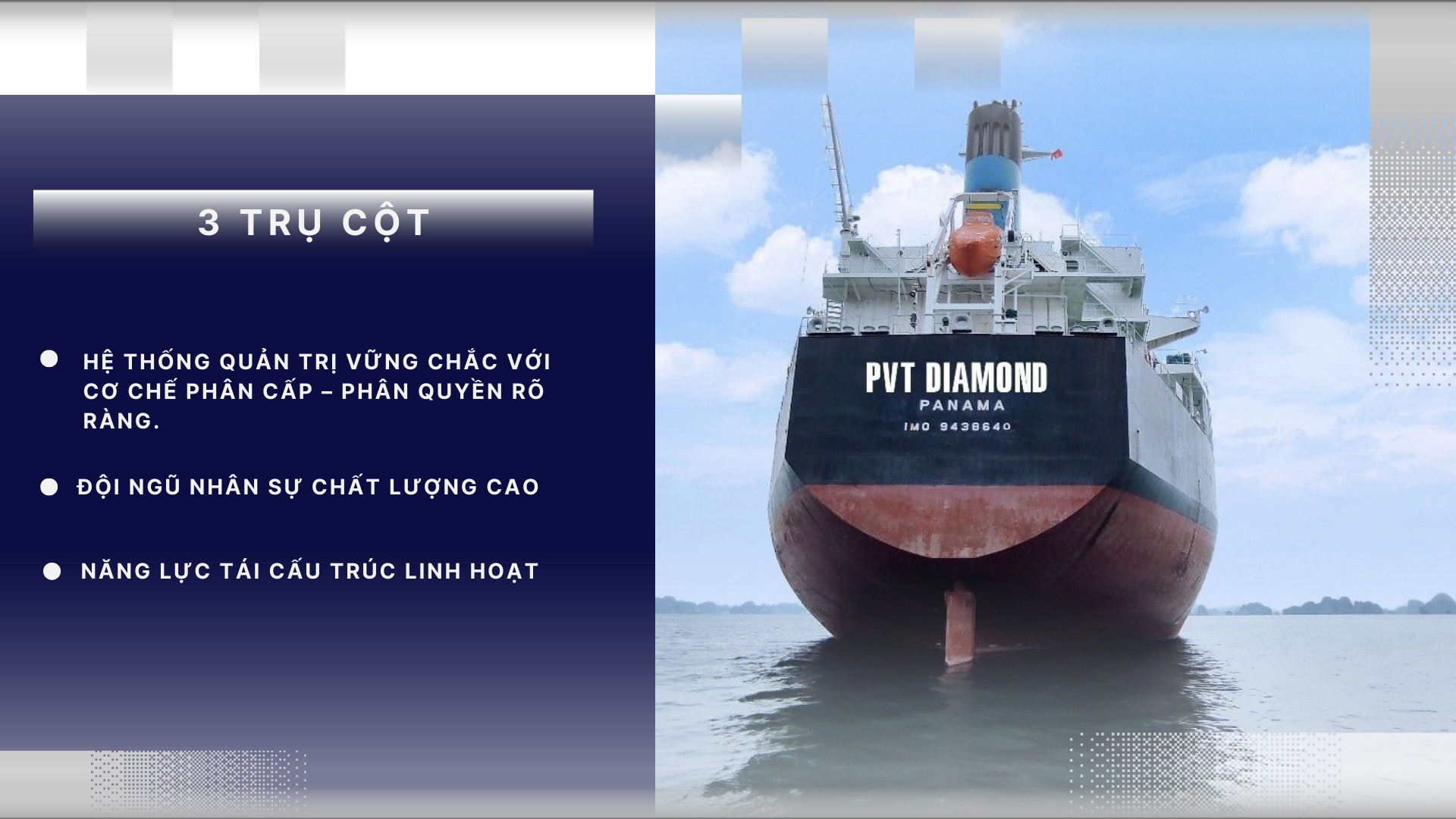 Trong một ngành tiềm ẩn nhiều rủi ro, PVTrans chọn “Sự tin cậy” làm giá trị cốt lõi – yếu tố định vị thương hiệu và là nền tảng để chinh phục những tầm cao mới. Với cổ đông và nhà đầu tư, đó là hiệu quả tăng trưởng 14 năm liên tục, cổ tức ổn định, quản trị minh bạch. Với khách hàng, đó là an toàn hàng hải và cam kết giao hàng đúng tiến độ theo chuẩn quốc tế.