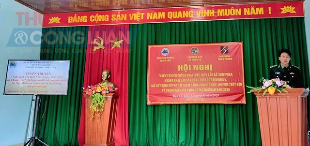 Ngày 15/1, Đồn Biên phòng Triệu Vân (Bộ đội Biên phòng tỉnh Quảng Trị) phối hợp với Hội Nông dân xã Triệu Cơ và Ngân hàng Nông nghiệp và Phát triển nông thôn Việt Nam (Agribank) Chi nhánh Triệu Phong tổ chức hội nghị tuyên truyền các quy định của pháp luật về khai thác thủy sản, phòng, chống khai thác thủy sản bất hợp pháp, không báo cáo và không theo quy định (IUU) gắn với phổ biến chính sách tín dụng hỗ trợ ngư dân năm 2026 cho bà con ngư dân trên địa bàn xã Triệu Cơ.