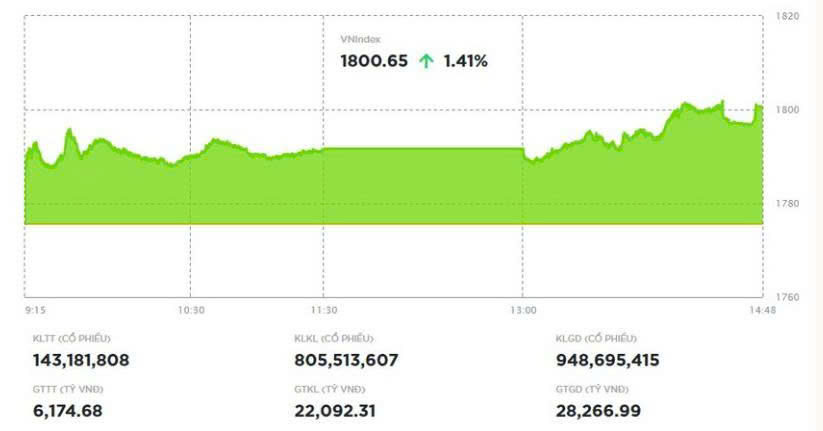 Cụ thể, chốt phiên VN-Index tăng 25 điểm (+1,41%) lên 1.800,65 điểm với tổng khối lượng giao dịch đạt 948,7 triệu đơn vị, giá trị 28.267 tỷ đồng, dù tăng 7% về khối lượng và 20,5% về giá trị so với phiên trước đó, nhưng cũng chỉ ở mức trung bình của 5 phiên gần đây. Trong đó, giao dịch thỏa thuận đóng góp 144 triệu đơn vị, giá trị 6.183 tỷ đồng.