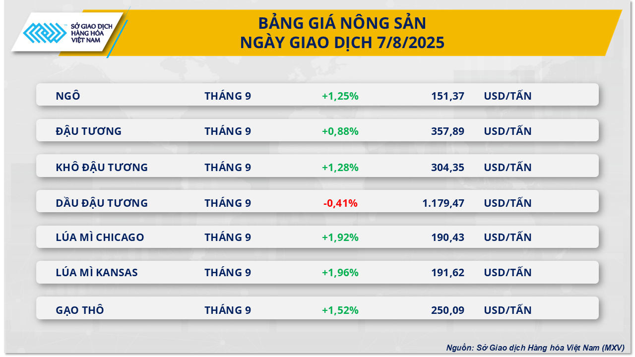 Kết thúc phiên giao dịch ngày 7/8, nhóm nông sản chứng kiến sự hồi phục mạnh mẽ khi 6 trên 7 mặt hàng đều tăng giá. Trong đó, ngô bật tăng trở lại sau chuỗi dài giảm giá sâu, rơi về tận đáy của một năm qua. Kết phiên, giá ngô tăng 1,25% lên 151.37 USD/tấn.