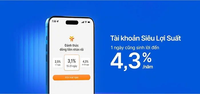 Với tài khoản Siêu Lợi Suất, tiền chờ chi sinh lời mỗi ngày với lợi suất lên đến 4,3%/năm. Bạn rút, chuyển, thanh toán bất cứ lúc nào mà không mất phần lợi nhuận đã tích lũy. Đây chính là câu trả lời cho câu hỏi mà Kaity đặt ra: "Làm sao để tiền của mình không ngủ quên nhưng vẫn sẵn sàng khi cần?".