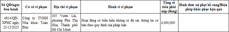 Hoạt động có biển hiệu không có đủ các thông tin cơ bản theo quy định của pháp luật, Công ty TNHH Nha Khoa Toàn Đức tại địa chỉ 305 Vườn Lài, phường Phú Thọ Hoà, TP. HCM bị phạt 4 triệu đồng theo Quyết định số 4814/QĐ-XPHC ngày 23/12/2025.