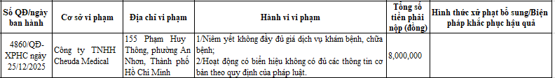 Kế đến là Công ty TNHH Cheuda Medical tại địa chỉ 155 Phan Huy Thông, phường An Nhơn, TP. HCM bị phạt 8 triệu đồng theo Quyết định số 4860/QĐ-XPHC ngày 25/12/2025. Hành vi vi phạm: Niêm yết không đầy đủ giá dịch vụ khám, chữa bệnh; Hoạt động có biển hiệu không có đủ các thông tin cơ bản theo quy định của pháp luật.