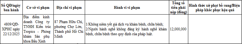 Địa điểm kinh doanh Công ty TNHH Kiến Trúc Tropics – Phòng khám Sản phụ khoa Bầu Xinh tại địa chỉ 87 Phạm Hữu Chi, phường Chợ Lớn, TP. HCM bị phạt 12 triệu đồng theo Quyết định số 4809/QĐ-XPHC ngày 22/12/2025.