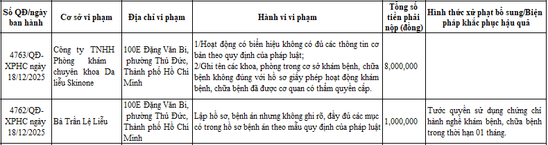 Công ty TNHH Phòng khám chuyên khoa da liễu Skinone địa chỉ 100E Đặng Văn Bi, phường Thủ Đức, TP. HCM bị phạt 8 triệu đồng theo Quyết định số 4763/QĐ-XPHC ngày 18/12/2025.