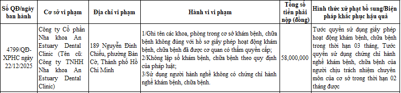 Tiếp đến là Công ty Cổ phần Nha Khoa An Estuary Dental Clinic tại địa chỉ 189 Nguyễn Đình Chiểu, phường Bàn Cờ, TP. HCM bị phạt với số tiền 58 triệu đồng theo Quyết định số 4799/QĐ-XPHC ngày 22/12/2025.
