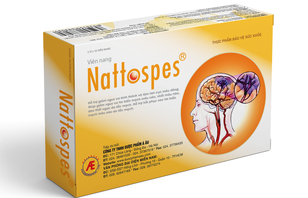 Thực phẩm bảo vệ sức khỏe Nattospes - Dùng cho người có nguy cơ tai biến mạch máu não do tắc mạch ![]() Thành phần: Mỗi viên nang thực phẩm bảo vệ sức khỏe Nattospes chứa nattokinase: 300FU Công dụng ● Hỗ trợ giảm nguy cơ hình thành và làm tan cục máu đông; ● Giúp giảm nguy cơ tai biến mạch máu não, nhồi máu não, đau thắt ngực do tắc mạch; ● Hỗ trợ hồi phục sau tai biến mạch máu não do tắc mạch. Đối tượng sử dụng - Người có nguy cơ tai biến mạch máu não do tắc mạch. - Người sau tai biến mạch máu não có các di chứng liệt, méo miệng, nói ngọng. Cách dùng - Liều hỗ trợ duy trì: Ngày uống 2 lần, mỗi lần 1 - 2 viên. - Liều hỗ trợ tăng cường: Ngày uống 2 - 3 lần, mỗi lần 2 viên. - Nên uống trước bữa ăn 30 phút hoặc sau khi ăn 1 giờ. Nên uống một đợt liên tục 2-3 tháng. Tiếp thị và phân phối bởi: Công ty TNHH Dược Phẩm Á Âu Á Âu: Địa chỉ an tâm, tin cậy, chất lượng suốt 20 năm Địa chỉ: 171 Chùa Láng - Phường Láng Thượng - Quận Đống Đa - Hà Nội ĐT: 024.38461530 - 028.62647169 Số giấy phép xác nhận quảng cáo: 01400/2019/ATTP-XNQC *Thực phẩm này không phải là thuốc và không có tác dụng thay thế thuốc chữa bệnh. *Sản phẩm có bán tại các nhà thuốc trên toàn quốc. |