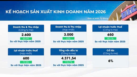 Năm 2026, phát huy kết quả đạt được, Tập đoàn DIC đặt chỉ tiêu doanh thu công ty mẹ đạt 2.600 tỷ đồng, doanh thu hợp nhất là 3.000 tỷ đồng; lợi nhuận trước thuế hợp nhất là 600 tỷ đồng; tỷ lệ chia cổ tức 6%.