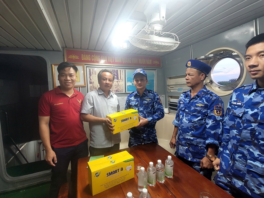 Đáng chú ý, để hỗ trợ chăm sóc sức khỏe cho cán bộ, chiến sĩ trong điều kiện đi biển dài ngày với nắng nóng gay gắt, thiếu nước ngọt và rau xanh, ông Hà Văn Nam - Giám đốc Công ty TNHH Ứng dụng Khoa học công nghệ quốc tế đã trực tiếp đến trao tặng hơn 200 chai Smart A và hướng dẫn cách sử dụng. Đây là món quà thiết thực, giúp bộ đội bảo đảm sức khỏe trong suốt hải trình, đồng thời có thể sử dụng để hỗ trợ y tế kịp thời cho ngư dân trên biển.