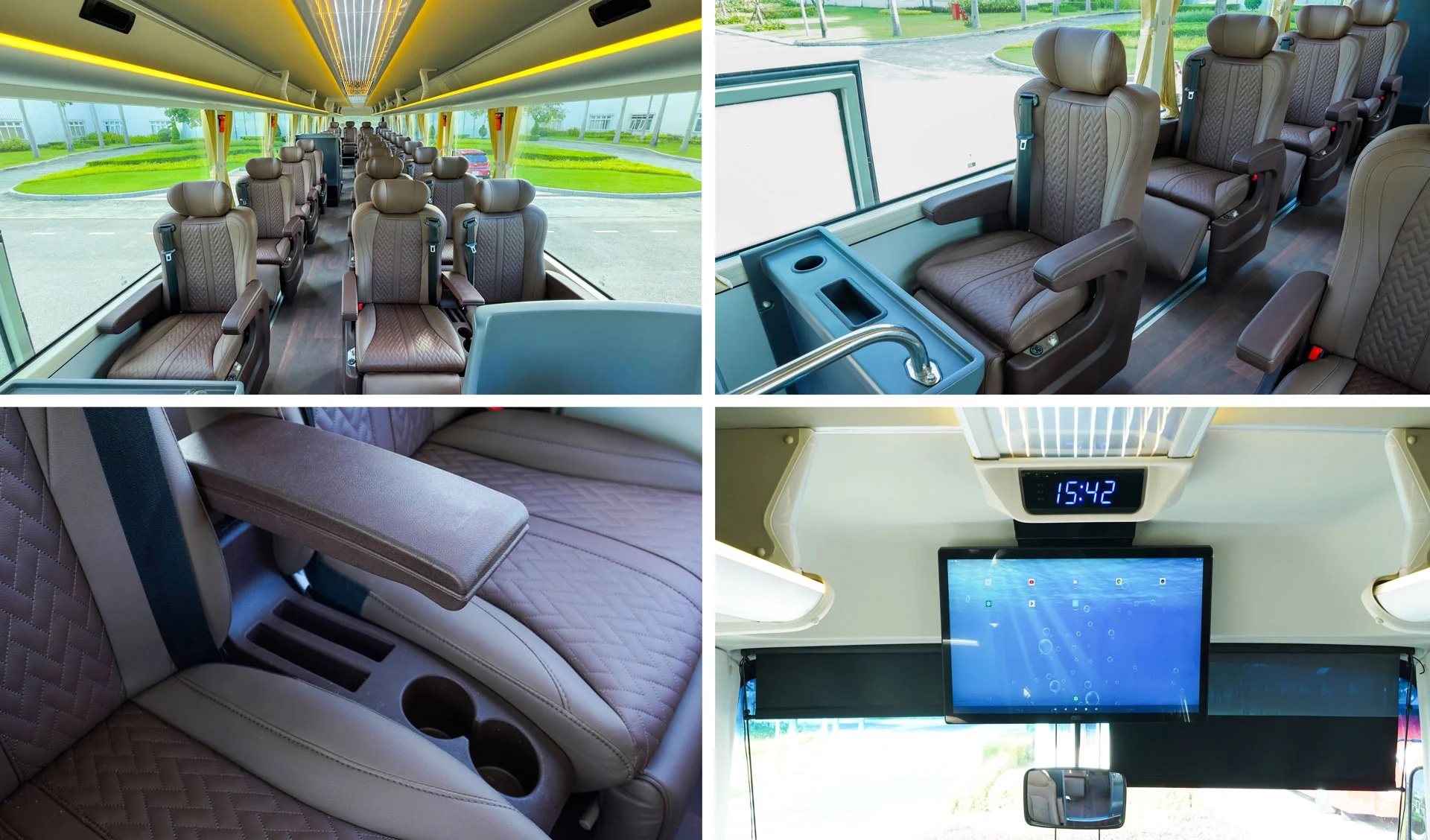 Sản phẩm được nghiên cứu, phát triển và sản xuất lắp ráp hoàn toàn bởi THACO AUTO, đáp ứng tiêu chuẩn khắt khe của đối tác quốc tế. Không gian khoang hành khách trang bị tiện nghi cao cấp, hướng đến sự thoải mái đối đa cho hành khách trên các chuyến đi dài. Nội thất được thiết kế tinh tế với ghế ngồi cao cấp bố trí theo layout 2:1, thiết kế công thái học với góc ngả tùy chỉnh linh hoạt, tích hợp dây đai an toàn. Xe được trang bị đầy đủ tiện ích cá nhân hóa với màn hình giải trí, cổng sạc điện thoại, khay để ly và túi lưới tạp chí.