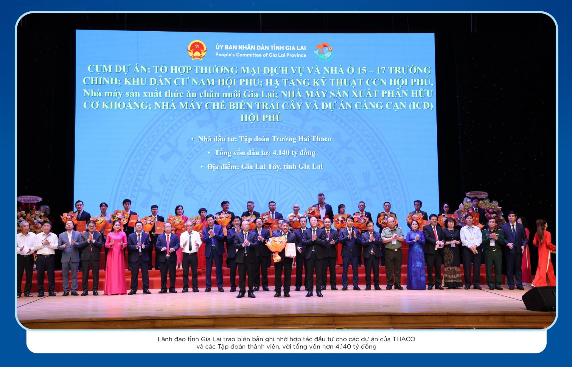 Trong khuôn khổ hội nghị, THACO và các Tập đoàn thành viên được trao biên bản ghi nhớ hợp tác đầu tư cho cụm dự án tại Gia Lai, gồm tổ hợp thương mại – dịch vụ và nhà ở tại 15 - 17 Trường Chinh; khu dân cư Nam Hội Phú; hạ tầng kỹ thuật Cụm công nghiệp Hội Phú; cùng các dự án Nhà máy sản xuất thức ăn chăn nuôi, Nhà máy sản xuất phân hữu cơ khoáng, Nhà máy chế biến trái cây và dự án cảng cạn (ICD) Hội Phú, với tổng vốn đầu tư hơn 4.140 tỷ đồng.
