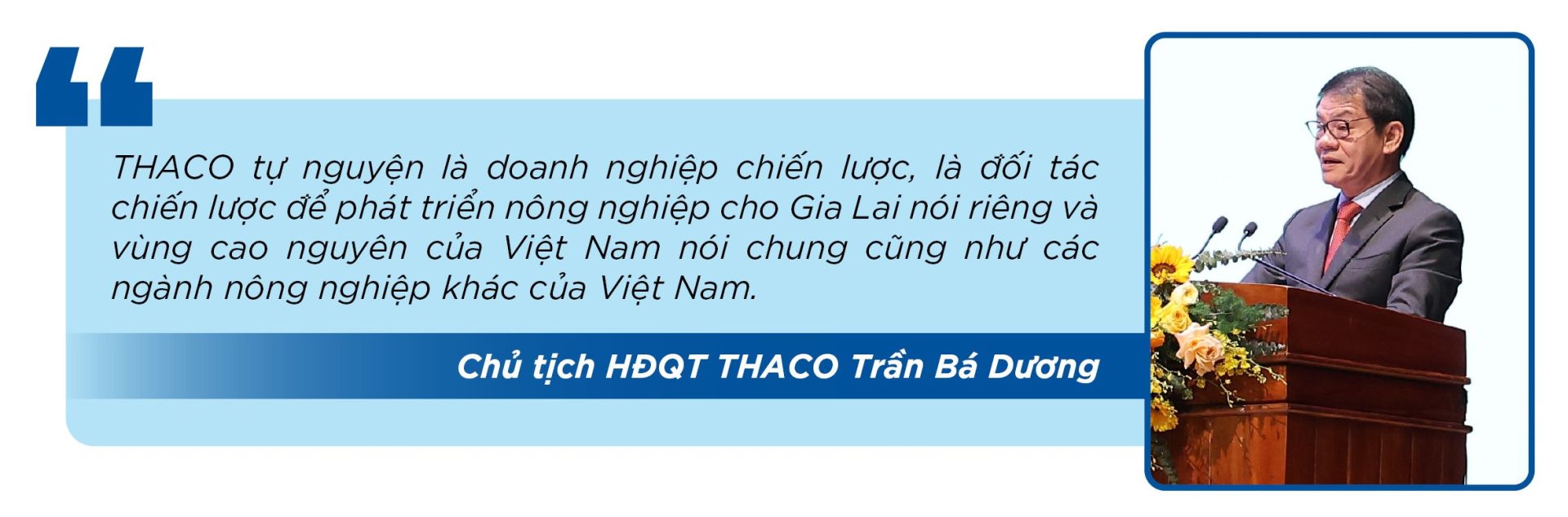 Với định hướng này, Gia Lai được xác định là một trong những địa bàn trọng điểm trong chiến lược phát triển nông nghiệp tích hợp của THACO, góp phần hình thành vùng sản xuất nông nghiệp bền vững quy mô lớn, tham gia sâu vào chuỗi giá trị và chuỗi cung ứng nông nghiệp toàn cầu.